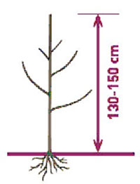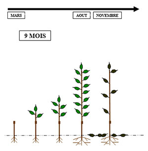 A 9 month tree is bench grafted in winter, planted in spring and lifted in the following autumn. Depending on the year and on the varieties, these trees can have more or less branches. A yield potential ranging from 3 to 4 kg per tree in the second year. A yield of 3 to 4 kg per tree can be expected in the second year and full yield can be reached within the fifth year depending on the orchard technology.